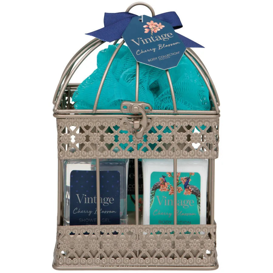 Brighten up any corner of your home with this dazzling Vintage Cage Set! With its classic bird cage and charming compliment of body care products, this set is the perfect way to pamper yourself or someone special. Treat your skin with the luxurious 155ml Shower Gel, Body Lotion, 80g Bath Salts, and 20g Shower Sponge, all wrapped up in one unforgettable package. What better excuse to indulge?